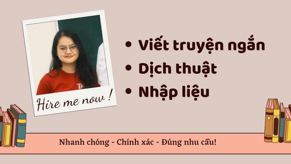 Viết truyện ngắn - Dịch thuật - Nhập liệu - Viết truyện ngắn: những câu chuyện ngắn đáp ứng yêu cầu đu fandom của bạn, hay là các câu chuyện đánh số để thu hút tương tác gắn link. - Dịch thuật: tiếng anh hay tiếng nhật, mình đều có thể bộc lộ được cảm xúc của tác giả, hãy trao nhau cơ hội nhé. - Nhập liệu: đảm bảo chính xác, không sử dụng A.I để bảo mật dữ liệu.