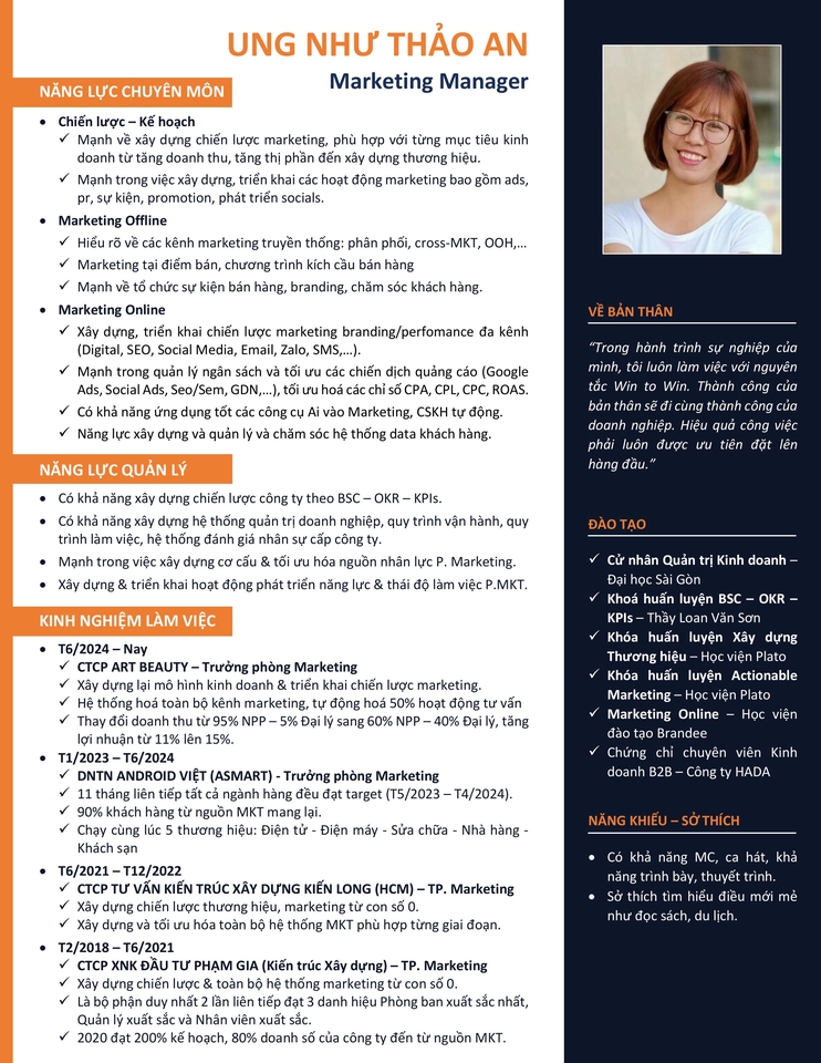 NĂNG LỰC QUẢN TRỊ - Xây dựng - Vận hành - Tái cấu trúc hệ thống marketing trong các lĩnh vực Beauty - Xây dựng - Nội thất - Bán lẻ - Điện tử – F&b – Hospitality. - Chiến lược & hệ thống: BSC – OKR – KPIs, theo 4 tiêu chí Tài chính - Khách hàng - Quy trình - Học hỏi phát triển. - Xây dựng quy trình vận hành, hệ thống chuyển đổi số cho toàn bộ doanh nghiệp - Xây dựng cơ cấu tổ chức - chuẩn hóa đánh giá hiệu suất cho từng bộ phận - nhân sự. - Xây dựng đội nhóm: tuyển dụng – đào tạo – phát triển năng lực & thái độ đội ngũ Marketing. NĂNG LỰC CHUYÊN MÔN - Xây dựng & tối ưu phễu: Branding + Performance đa kênh (Digital, SEO, Social, Email, Zalo, SMS, OOH, tại điểm bán). - Quản trị ngân sách & tối ưu chỉ số: CPA, CPL, CPC, ROI, ROAS. - Data & Automation: Ứng dụng AI vào tư vấn/CSKH, chăm sóc – nuôi dưỡng leads; xây & chăm hệ thống data khách hàng. - Tổ chức activation / sales event / chương trình kích cầu & gia tăng khách hàng trung thành. - Xây dựng các chiến lược truyền thông, content hấp dẫn, đáp ứng insight hoặc các nỗi đau khách hàng. THÀNH TỰU ĐẠT ĐƯỢC - MẢNG BEAUTY: Chuyển đổi mô hình kinh doanh từ 95% NPP sang 60% NPP - 40% Đại lý, tăng tỷ suất lợi nhuận từ 10% lên 15%. - DOANH NGHIỆP ĐA NGÀNH (MẢNG ĐIỆN THOẠI - ĐIỆN MÁY - F&B - HOSPITALITY): Tái cấu trúc hệ thống Marketing, 11 tháng liên tiếp cả 5 ngành hàng đều đạt 90% - 120% target, 90% khách hàng từ nguồn MKT. - MẢNG XÂY DỰNG: Xây dựng toàn bộ hệ thống Marketing từ lúc bắt đầu, đạt 200% kế hoạch năm, 80% doanh số từ MKT, MER 1,8%. Sau khoảng 2 năm làm việc và chạy dự án tại Đà Nẵng, thì mình nhận ra rằng các sếp rất thích nhân sự đa-zi-năng. Và trộm vía mình chính là người như thế. Mình không ngại bất kỳ một nhiệm vụ nào miễn là nó có mục tiêu cụ thể và thực sự đáng để mình triển khai. Mình chỉ nhận tối đa 2 dự án, vì mình sẽ dành rất nhiều thời gian cho nó. Nên mình cần tìm job/dự án đủ lớn để mình vùng vẫy ạ. Hiện mình rất sẵn sàng để có những buổi trao đổi sâu với Anh/Chị chủ doanh nghiệp, để hiểu hơn về nội tại và đưa ra các định hướng tối ưu nhất. Đừng ngần ngại mà liên hệ với mình ạ.