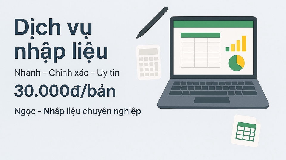 Tôi cung cấp dịch vụ nhập liệu chuyên nghiệp, chính xác và đúng thời hạn. Nhận nhập dữ liệu từ file PDF, hình ảnh, biểu mẫu, đơn hàng, hoặc tài liệu thủ công sang Excel, Word hoặc Google Sheet. Cam kết: • Nhập liệu nhanh, tỉ mỉ, không sai sót. • Bảo mật tuyệt đối thông tin khách hàng. • Chỉnh sửa miễn phí nếu có yêu cầu. • Hỗ trợ linh hoạt theo khối lượng công việc. Giá chỉ từ 30.000đ/bản, phù hợp cho cá nhân, doanh nghiệp, và đơn vị cần xử lý số liệu lớn.