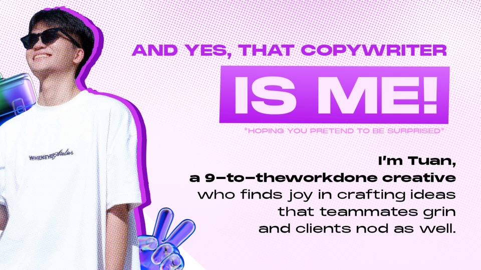 Gần 2 năm kinh nghiệm làm Copywiter và Content Writer, Brendan tự tin vào giá trị có thể đem lại thông qua những tên tuổi Khách hàng chất lượng như Acecook; L'Oréal; Suntory PepsiCo; Abbott;... I basically think, draft, and "play" with words every single day. I myself appreciate it, the process of creating the creativity.