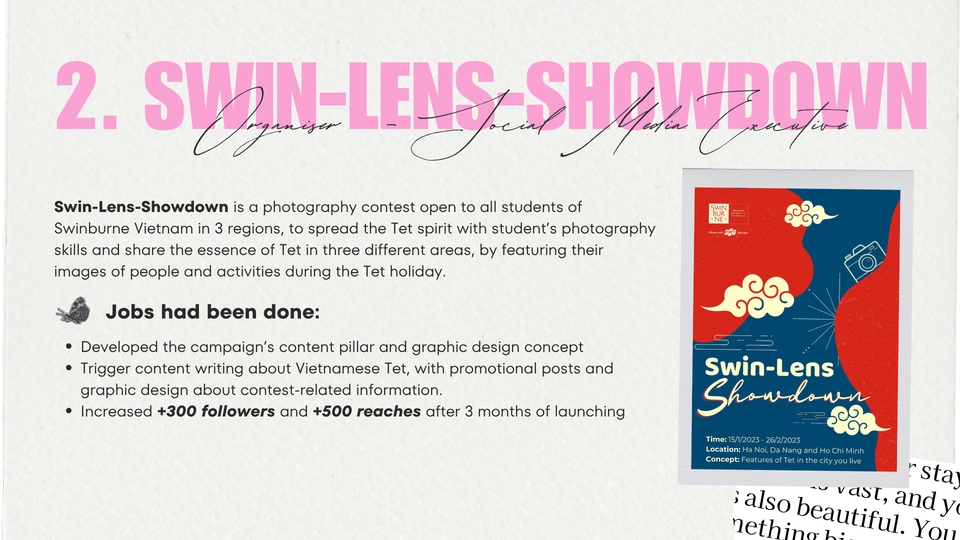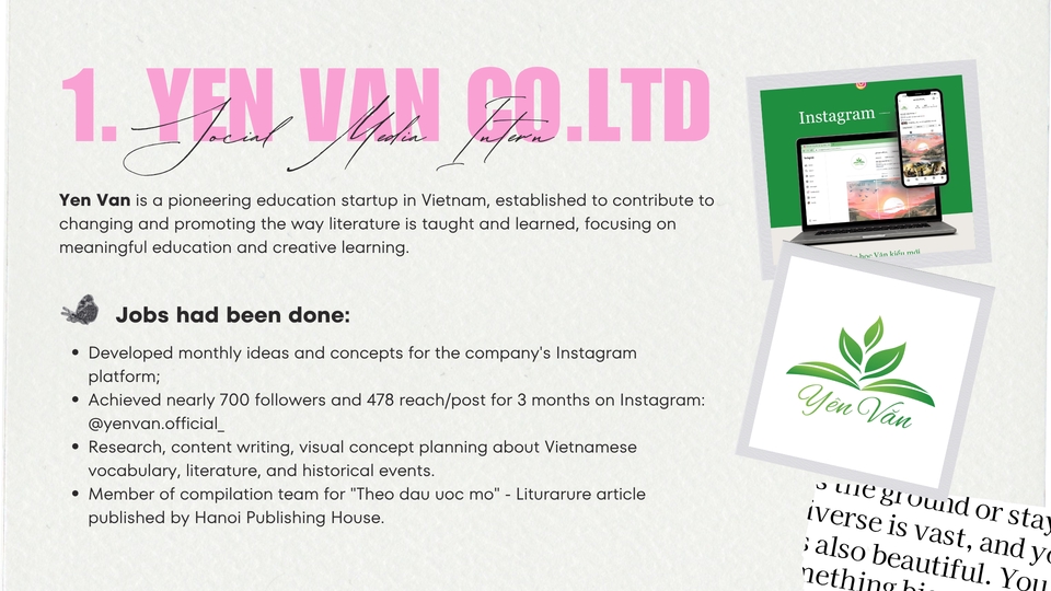 Được giáo dục trong môi trường quốc tế và tham gia nhiều dự án lớn nhỏ, tôi đã phát triển kỹ năng trong các lĩnh vực truyền thông như quản lý dự án, truyền thông xã hội, báo chí, và phát triển quan hệ chiến lược. Với tinh thần trách nhiệm và năng động, tôi sẵn sàng đón nhận cơ hội mới và gây ấn tượng qua tư duy chiến lược, sự sáng tạo và khả năng xây dựng mối quan hệ.