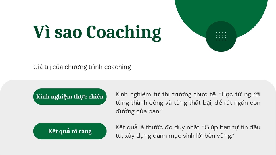 1. Phạm Vi Công Việc Coaching & Mentoring Đầu Tư Cá Nhân Định hướng tài chính cá nhân (thấu hiểu bản thân): Phân tích mục tiêu, mức độ chấp nhận rủi ro, khả năng tài chính để xây dựng chiến lược đầu tư phù hợp. Theo từng cá nhân. Huấn luyện 1:1: Mỗi học viên sẽ được đào tạo và kèm cặp trực tiếp bởi chuyên gia, theo lộ trình cá nhân hóa. Hướng dẫn tự Phân tích thị trường & cổ phiếu, xu hướng: Hướng dẫn tự nghiên cứu phân tích kinh tế vĩ mô, cách đọc báo cáo tài chính, phân tích kỹ thuật, phân tích cơ bản và áp dụng vào từng tình huống thực tế. Xây dựng danh mục đầu tư: Cân bằng giữa tăng trưởng và an toàn, điều chỉnh linh hoạt theo biến động thị trường. Kỹ năng quản trị Tâm lý giao dịch: Quản trị Làm chủ cảm xúc, vượt qua nỗi sợ thua lỗ và lòng tham khi đầu tư. Đào Tạo Theo Nhóm Workshop chuyên đề: Phân tích thị trường, kỹ thuật quản trị rủi ro, chiến lược giao dịch theo xu hướng. Case study thực tế: Các tình huống điển hình từ thị trường chứng khoán Việt Nam và quốc tế, giúp học viên áp dụng kiến thức ngay lập tức. Thảo luận & phản biện: Tạo môi trường trao đổi, học hỏi từ chính trải nghiệm của nhau. Dịch Vụ Bổ Trợ Cập nhật thị trường hằng tuần: Bản tin phân tích độc quyền gửi riêng cho học viên. Tư vấn nhanh theo yêu cầu: Khi học viên cần ra quyết định gấp, có thể liên hệ để nhận hỗ trợ. Tài liệu học tập & bộ công cụ: Checklist đầu tư, mẫu quản ghi chép nhật ký, phân tích. 2. Kinh Nghiệm & Chuyên Môn 10 năm đầu tư thực chiến trên thị trường chứng khoán Việt Nam với trải nghiệm cả thành công lẫn thất bại. Am hiểu phân tích tài chính & quản trị rủi ro: từ phân tích vĩ mô chu khỳ, phân tích cơ bản (FA) đến phân tích kỹ thuật (TA). Tốt nghiệp & đào tạo chuyên sâu: tham gia nhiều khóa học đầu tư trong và ngoài nước, tích lũy kiến thức đa chiều. Kinh nghiệm coaching & mentoring cá nhân: đã kèm cặp nhiều học viên từ con số 0 đến tự tin xây dựng danh mục đầu tư riêng. Phương pháp đào tạo đặc biệt: kết hợp giữa lý thuyết - thực hành - phản biện - theo dõi kết quả. 3. Quy Trình Làm Việc Khảo sát ban đầu Thảo luận mục tiêu đầu tư, kinh nghiệm hiện tại, phong cách học tập. Đánh giá mức độ chấp nhận rủi ro và kỳ vọng lợi nhuận. Xây dựng lộ trình cá nhân hóa Lập kế hoạch chi tiết: kỹ năng cần bổ sung, chủ đề ưu tiên, thời gian huấn luyện. Thống nhất giữa coach và học viên về cam kết hai bên. Huấn luyện & Thực hành Hướng dẫn tự nghiên cứu lý thuyết cốt lõi: Đánh giá vĩ mô, phân tích kỹ thuật, phân tích cơ bản, tâm lý thị trường. Thực hành qua ví dụ thị trường đang diễn ra. Học viên được giao bài tập đầu tư thực tế và được feedback. Theo dõi & Phản hồi liên tục Cập nhật tiến độ học viên hằng tuần. Điều chỉnh phương pháp khi cần thiết để phù hợp với từng cá nhân. Đánh giá kết quả Xem xét hiệu quả giao dịch, khả năng phân tích, sự thay đổi trong tư duy. Đề xuất bước tiếp theo: nâng cao, mở rộng danh mục, hoặc tự quản lý. Hỗ trợ sau khóa học Học viên vẫn nhận được bản tin thị trường. Có thể đăng ký buổi kèm cặp bổ sung nếu cần. 4. Yêu Cầu Từ Khách Hàng Để đảm bảo coaching hiệu quả, học viên cần chuẩn bị: Thông tin cá nhân tài chính cơ bản: mục tiêu, nguồn vốn, mức độ rủi ro chấp nhận. Thái độ học tập tích cực: cam kết tham gia đầy đủ, làm bài tập và thực hành. Minh bạch & trung thực: chia sẻ đúng tình trạng đầu tư hiện tại để được tư vấn chính xác. Công cụ cần thiết: laptop, kết nối internet ổn định, tài khoản chứng khoán. Tinh thần cầu thị: sẵn sàng tiếp nhận phản hồi, chỉnh sửa thói quen cũ. 5. Điều Khoản & Điều Kiện Phạm vi dịch vụ: chỉ cung cấp coaching & mentoring đầu tư, không nhận tư vấn đầu tư, quản lý vốn hay nhận ủy thác đầu tư. Không cam kết lợi nhuận tuyệt đối: coaching hướng đến xây dựng tư duy và kỹ năng lâu dài, không bảo đảm “kiếm lời ngay”. Bảo mật thông tin: toàn bộ dữ liệu tài chính và thông tin cá nhân của học viên được giữ bí mật tuyệt đối. Thanh toán & lịch học: học viên cần thanh toán trước từng gói dịch vụ, sắp xếp lịch theo thỏa thuận. Hủy/hoãn buổi học: thông báo trước ít nhất 24h. Không nhận coaching cho hoạt động liên quan đến cờ bạc, tiền ảo đa cấp, hoặc các hình thức đầu tư phi pháp.