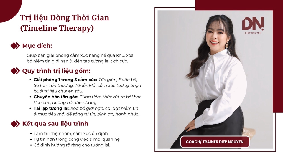 Trị liệu Dòng Thời Gian (Timeline Therapy) Trị liệu Dòng Thời Gian là một phương pháp tâm lý trị liệu giúp bạn giải phóng cảm xúc tiêu cực từ gốc rễ quá khứ, xóa bỏ niềm tin giới hạn và kiến tạo tương lai tích cực. ✨ Trong mỗi buổi trị liệu, bạn sẽ được hướng dẫn quay về dòng thời gian cá nhân để quan sát sự kiện gốc ở một vị trí an toàn. Tại đây, bạn có thể: - Nhận diện và giải phóng 1 trong 5 cảm xúc sâu nhất (Tức giận, Buồn bã, Sợ hãi, Tổn thương, Tội lỗi). - Cùng tiềm thức rút ra bài học tích cực từ sự kiện đó để buông bỏ nhẹ nhàng. - Tái lập niềm tin và mục tiêu mới trên dòng thời gian, giúp bạn tự tin và bình an hơn trong cuộc sống. ✨ Kết quả sau liệu trình: - Cảm xúc ổn định, tâm trí nhẹ nhàng. - Giảm căng thẳng, ngủ ngon và tập trung hơn. - Tự tin hơn trong công việc, tình cảm và mối quan hệ. - Có định hướng rõ ràng để tiến tới tương lai mong muốn.