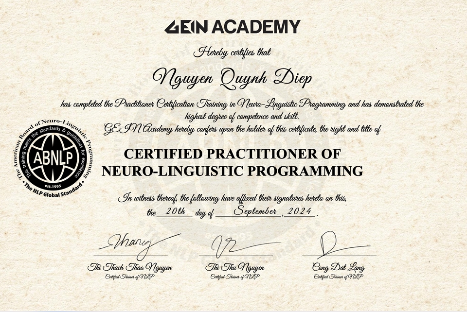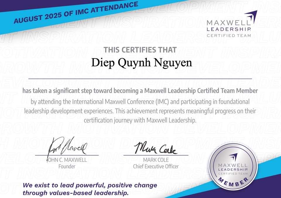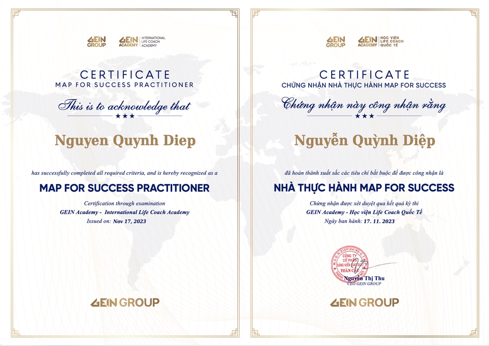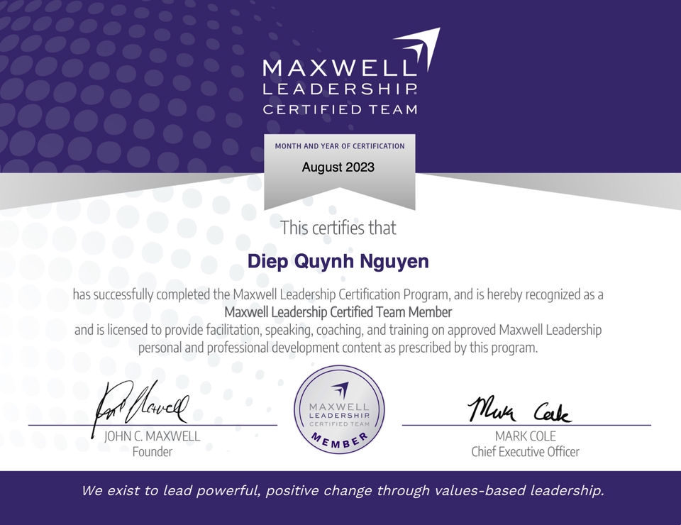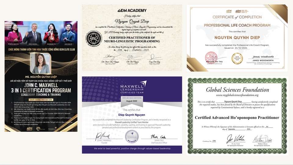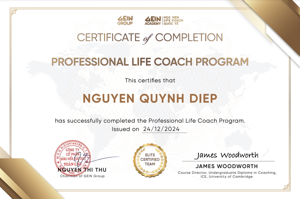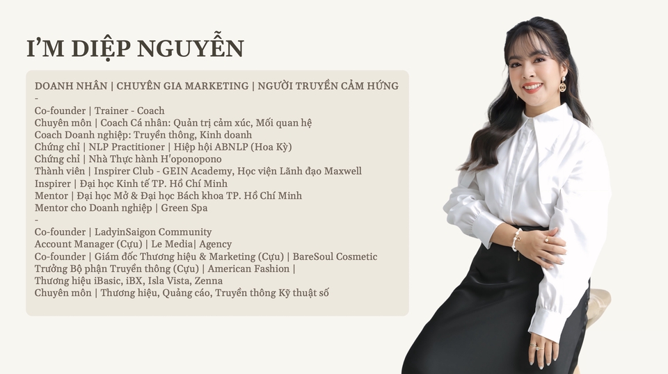 Coach Diệp Nguyễn | Emotional Intelligence Trainer & Life Coach for Modern Women Với 13 năm kinh nghiệm trong truyền thông và huấn luyện để đồng hành cùng phụ nữ hiện đại trên hành trình làm chủ cảm xúc, khai mở trí tuệ & nuôi dưỡng sự tự tin. Ứng dụng NLP, Timeline Therapy, H’oponopono, Năng lượng số giúp thân chủ soi sáng “điểm mù” nội tâm, chữa lành mối quan hệ & tìm lại sự cân bằng, hạnh phúc.