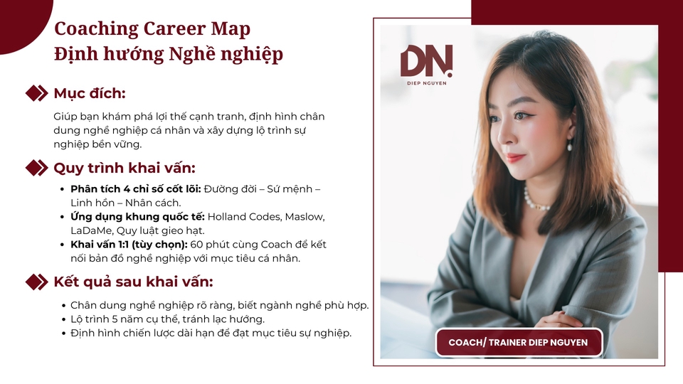 🌟 Mục đích: - Giúp cá nhân xác định lợi thế cạnh tranh và chân dung nghề nghiệp riêng. - Định hướng rõ ràng con đường sự nghiệp dựa trên 4 chỉ số cốt lõi (Đường đời – Sứ mệnh – Linh hồn – Nhân cách), kết hợp các khung tham chiếu quốc tế (Holland Codes RIASEC, tháp Maslow, khung Ladame…). - Tránh lạc hướng trong lựa chọn nghề nghiệp, xây dựng lộ trình phát triển 5 năm và chiến lược dài hạn. 🛠️ Quy trình khai vấn (Coaching Process) - Trước buổi coaching: Khách hàng nhận bản Career Map cá nhân hóa (bản đồ nghề nghiệp). - Trong 60 phút coaching: + Coach khai thác nhu cầu, mong muốn, bối cảnh thực tế. + Làm rõ ý nghĩa các chỉ số trong Career Map. + Kết nối bản đồ nghề nghiệp với mục tiêu cá nhân. + Đề xuất các bước hành động cụ thể để ứng dụng ngay. ✅ Kết quả sau khai vấn - Có bức tranh rõ ràng về nghề nghiệp: mình hợp với ngành nào, công việc nào. - Biết cách tận dụng điểm mạnh, cải thiện điểm yếu. - Có lộ trình 5 năm rõ ràng với các cột mốc quan trọng. - Được truyền động lực, định hình tư duy và chiến lược sự nghiệp dài hạn. 💰 Gói dịch vụ - Chỉ Career Map (bản đồ nghề nghiệp cá nhân hóa): 600.000đ - Career Map + 60 phút khai vấn 1:1 với Coach: 2.000.000đ