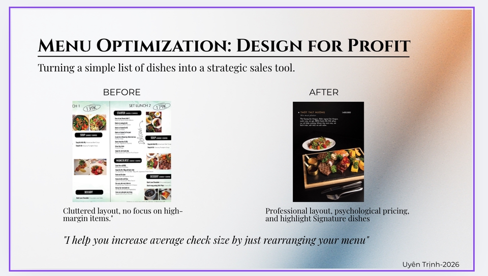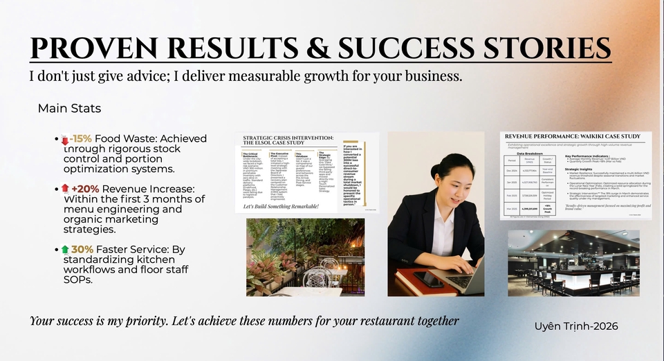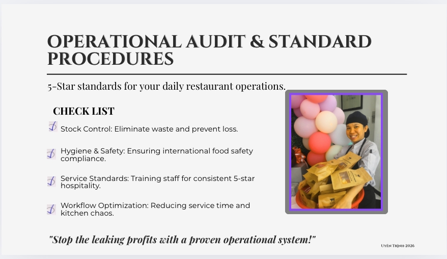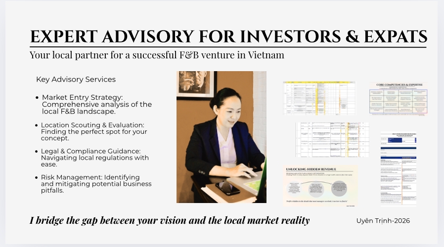 TƯ VẤN CHIẾN LƯỢC ĐẦU TƯ & SETUP NHÀ HÀNG Xin chào các anh/ chị chủ đầu tư, Anh/ chị đang muốn mở quán nhưng chưa biết bắt đầu từ đâu hoặc lo lắng về rủi ro? Với 20 năm thực chiến trong ngành F&B, tôi sẽ giúp bạn xây dựng nền móng vững chắc nhất. Nội dung tư vấn bao gồm: 1. Khảo sát địa điểm và đánh giá tiềm năng mặt bằng. 2. Xây dựng Concept (ý tưởng) quán độc đáo, phù hợp với đối tượng khách hàng mục tiêu. 3. Lập kế hoạch kinh doanh và dự toán tài chính (ROI) chi tiết. 4. Tư vấn quy trình vận hành từ lúc khởi tạo đến khi khai trương. Rất mong được hợp tác với anh/ chị!