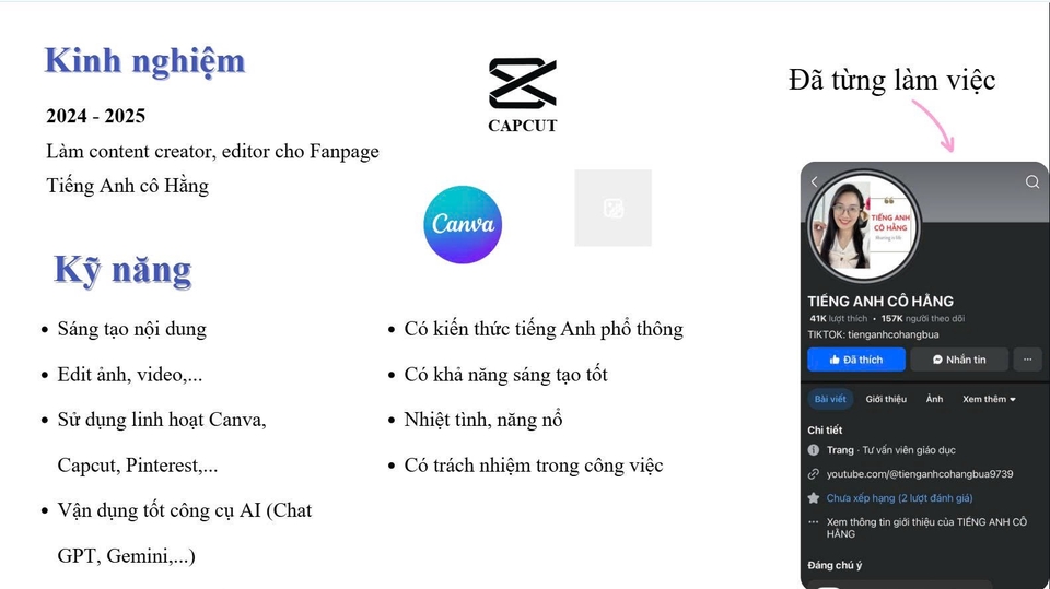 - Sáng tạo Content tốt, phù hợp với các page, web,... - Thông thạo CANVA edit ảnh, logo, nhận diện thương hiệu. - Thông thạo CAPCUT edit video, hiệu ứng, nhạc theo xu hướng. - Vận dụng tốt các phần mềm AI để làm hình ảnh, nội dung như Chat GPT, Gemini, Adobe,... - HSG Văn, khả năng viết lách tốt, giao tiếp cuốn hút khách hàng. - Biết sử dụng thành thạo Word, Excel, có chứng chỉ tin học cơ bản. - Tiếng Anh phổ thông, đọc hiểu tương đối tốt. - Luôn giữ bản thân năng động, cầu tiến, không ngại khó khăn, thử thách, hoàn thành nhiệm vụ