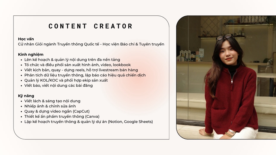 Mình là Content Creator tự do, có kinh nghiệm làm việc trong ngành thời trang, truyền thông và báo chí. Mạnh về viết nội dung, chụp ảnh, dựng reels, xây dựng kế hoạch truyền thông và quản lý mạng xã hội. Mình luôn chú trọng kể câu chuyện thương hiệu một cách sáng tạo và chân thực.