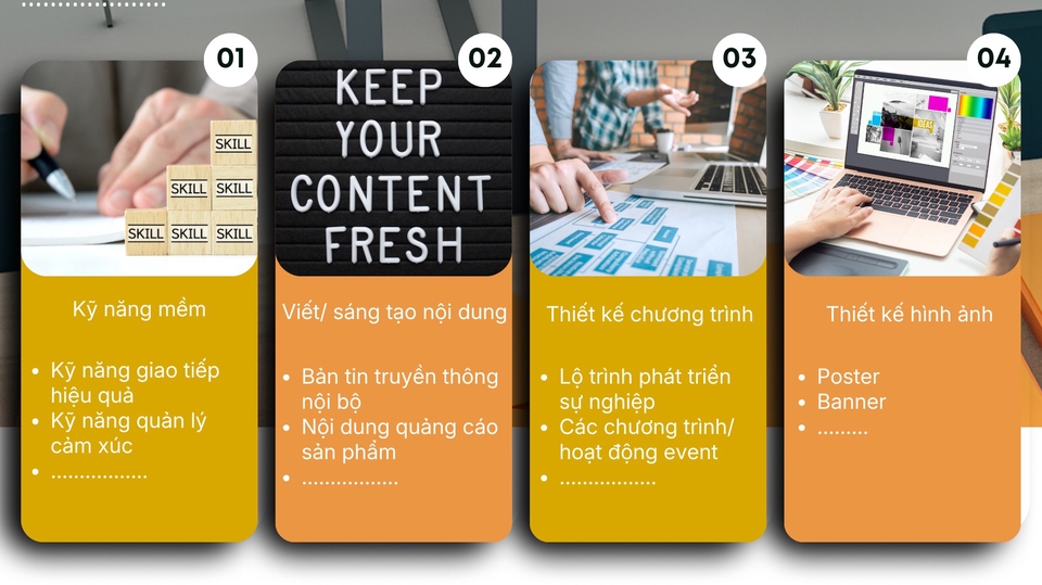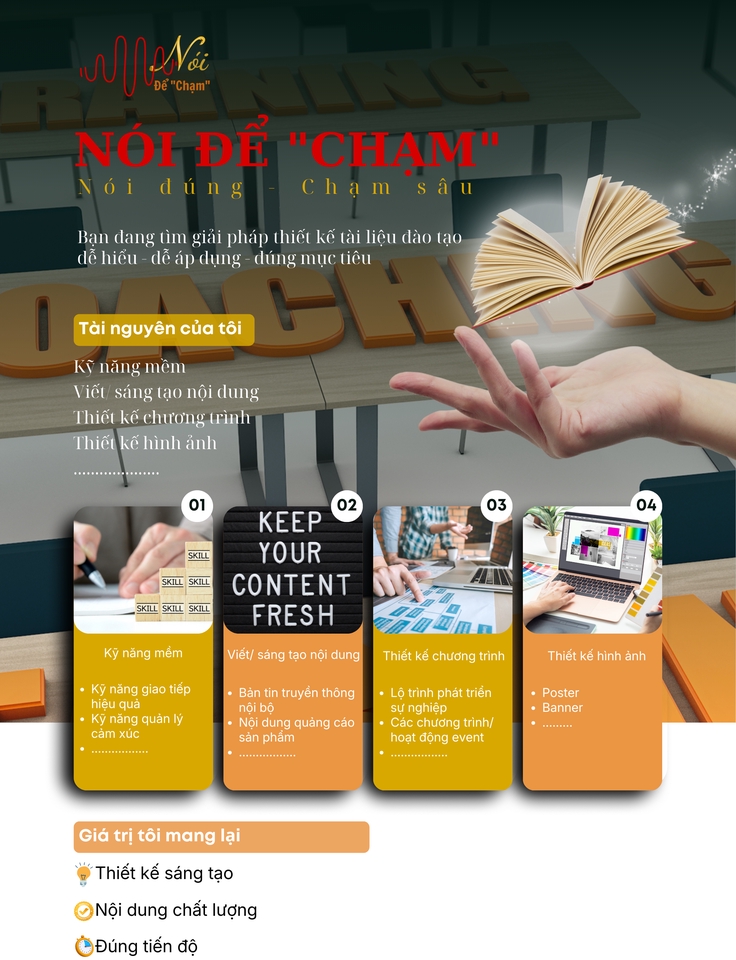 Mình đã có kinh nghiệm hơn 10 năm trong lĩnh vực đào tạo bán hàng, đào tạo kỹ năng mềm. Mình chuyên về thiết kế/ biên soạn tài liệu giảng dạy. Thiết kế bản tin truyền thông, sáng tạo các nội dung liên quan giảng dạy/ viết content.. Các chứng chỉ mình đang có như Train The Trainer, Thiết kế PownPoint Pro......