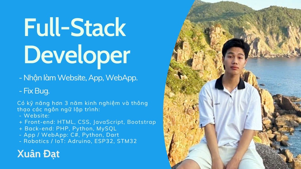 Có kinh nghiệm trong lập trình web full stack 3 năm - Web: + Front-end: HTML, CSS, JavaScript, Bootstrap. + Back-end: PHP, Python - App/ WebApp: C#, Python, Dart - Robotics/ IoT: Arduino, ESP32, STM32
