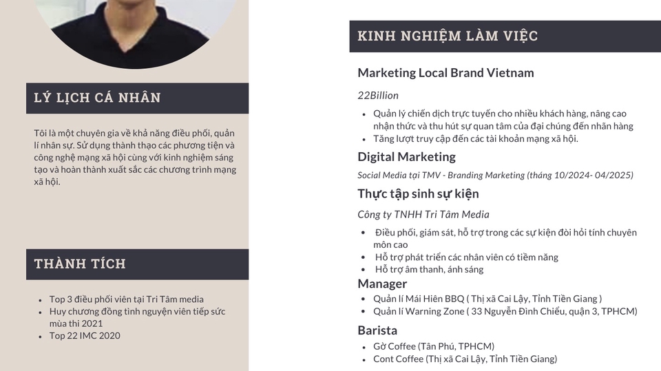 Tôi là một chuyện gia về mảng Social Media, thành thạo Capcut, Canva. Có khả năng giải quyết vấn đề logic và chịu được áp lực cao, khả năng thích nghi tốt, giỏi giao tiếp.