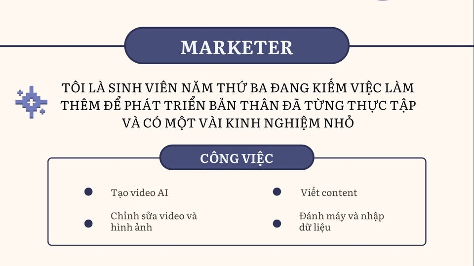 Là sinh viên năng động, tôi nhận làm freelance Marketing bán thời gian. Tôi có thể viết content sáng tạo, thiết kế hình ảnh, đến chỉnh sửa video cơ bản. Nhiệt tình, bắt trend nhanh và hoàn thành đúng deadline
