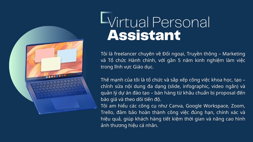 Tôi là freelancer chuyên về Đối ngoại, Truyền thông – Marketing và Tổ chức Hành chính, với gần 5 năm kinh nghiệm làm việc trong lĩnh vực Giáo dục. Với thế mạnh là quản lý dự án đa lĩnh vực, xây dựng mối quan hệ bền vững thì trong 3 năm qua, tôi đã kết nối và hợp tác với hơn 150 doanh nghiệp, đồng thời tổ chức - điều phối hơn 200 sự kiện lớn nhỏ, từ hội thảo, lễ ký kết hợp tác, ngày hội việc làm.