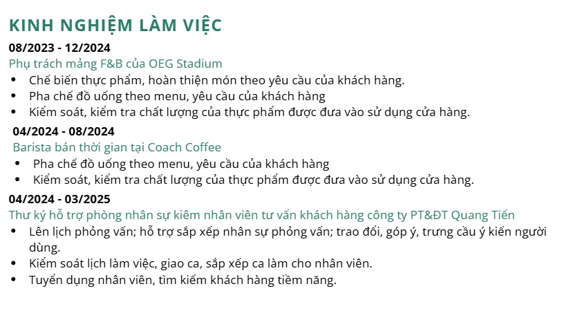 Sinh viên cử nhân Tâm lý học, có kinh nghiệm nhiều lĩnh vực: "Viết content, lên kế hoạch, hỗ trợ đưa ra ý kiến, ....