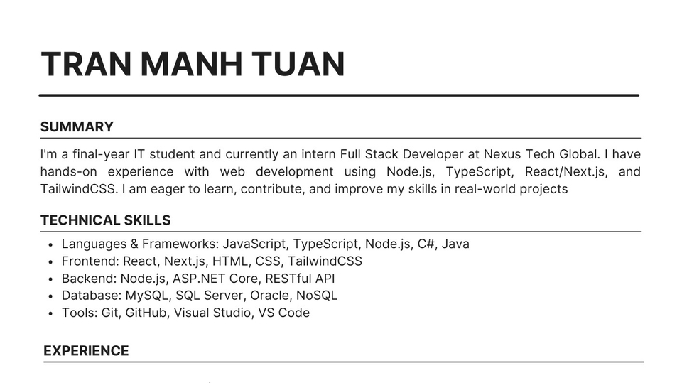 Tôi là sinh viên IT và hiện tại đang làm part-time tại một công ty tên là NexusTechGlobal với vị trí full-stack developer