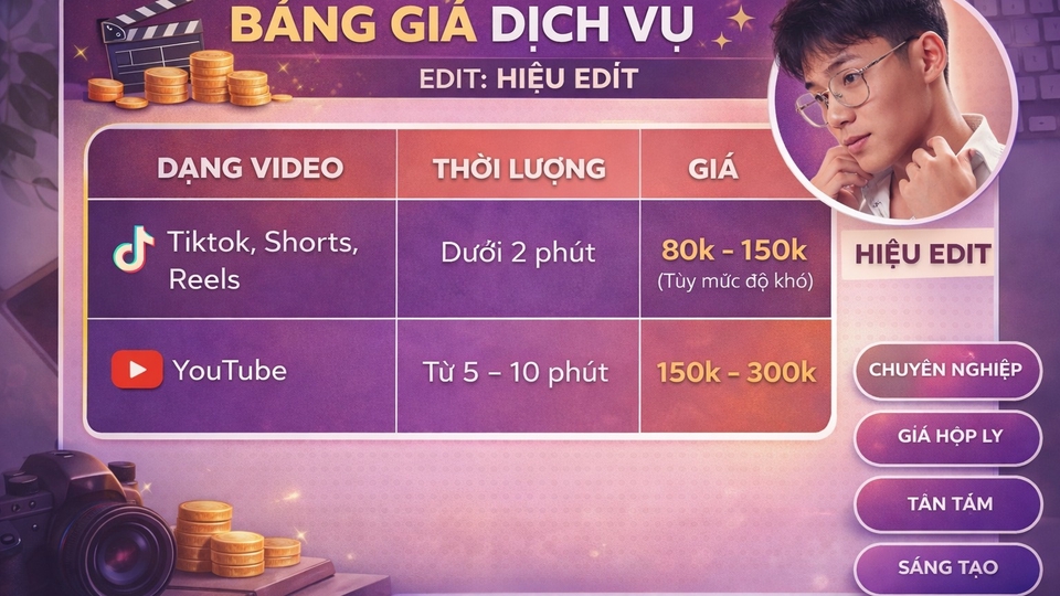 Video Editor sáng tạo, bắt trend nhanh, dựng video thu hút giúp tăng view và giữ chân người xem. Cam kết đúng deadline, chỉnh sửa đến khi bạn hài lòng.