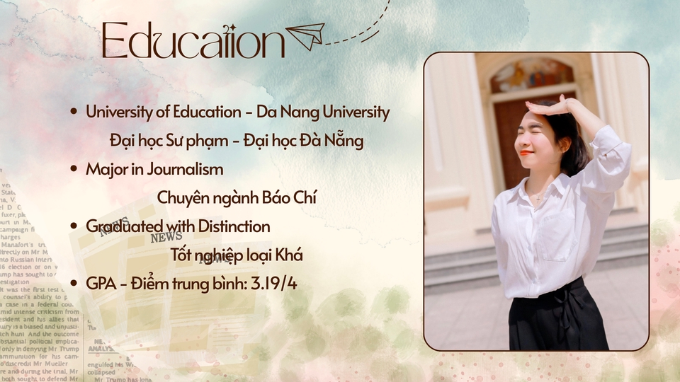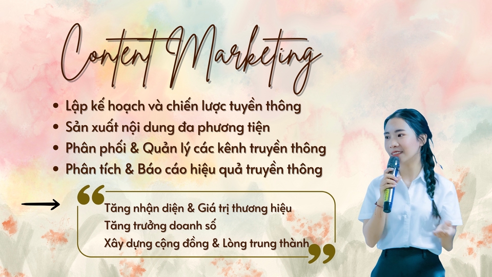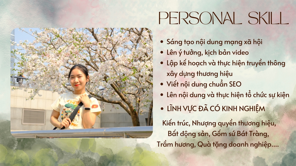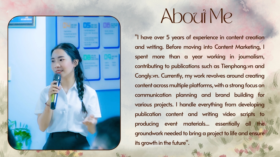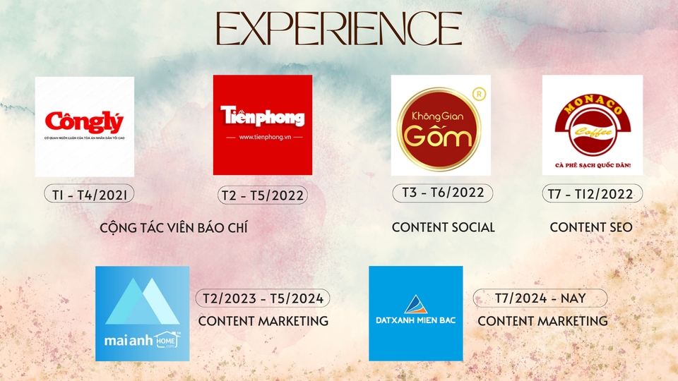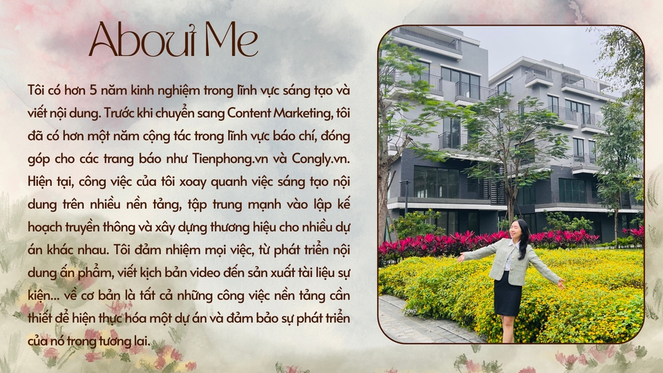 Tôi tốt nghiệp chuyên ngành Báo chí, có hơn 4 năm kinh nghiệm làm việc trong lĩnh vực marketing (phụ trách chính mảng Content). Phần lớn công việc của tôi là lập kế hoạch và triển khai tuyến nội dung trên các nền tảng mạng xã hội và báo chí, đa dạng thể loại từ bài post, PR, báo chí, kịch bản truyền hình, short video …. cho một số mảng như bất động sản, nội thất, thương hiệu nhượng quyền…