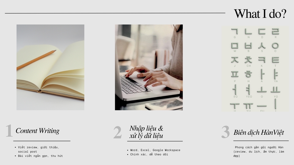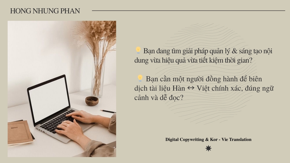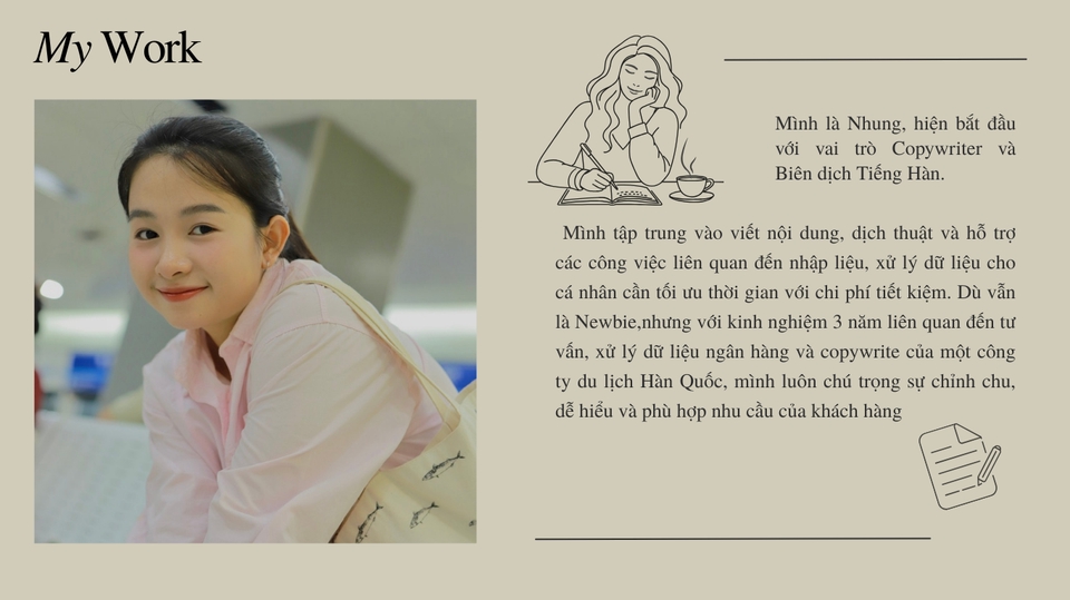 Xin chào! mình là Nhung, hiện mình cung cấp dịch vụ Content Writing, nhập liệu & xử lý dữ liệu (Word, Excel, Google Workspace), Biên dịch Hàn - Việt, Hàn - Anh với chi phí tiết kiệm nhưng vẫn đảm bảo chất lượng, chỉnh chu và dễ sử dụng Thiết kế để phù hợp nhu cầu và ngân sách của bạn, linh hoạt trao đổi & chỉnh sửa đến khi bạn hài lòng