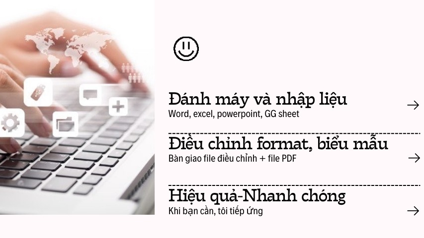 Soạn thảo văn bản từ hình ảnh, file scan, các file dữ liệu không thể coppy Nhập liệu Excel/Google Sheet theo form có sẵn/theo yêu cầu (danh sách, bảng số liệu, thông tin sản phẩm, v.v.) Chỉnh sửa lỗi chính tả, định dạng format Nhập liệu tiếng Việt/tiếng Anh/tiếng Trung căn bản. (Tiếng Trung có sẵn Pinyin) Cam kết bảo mật thông tin khách hàng. Hỗ trợ chỉnh sửa lại sau khi bàn giao