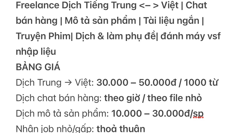 Xin chào, mình là Hương – freelance dịch tiếng Trung – Việt / Việt – Trung. Mình nhận dịch chat bán hàng Taobao/1688, mô tả sản phẩm, caption bán hàng và tài liệu ngắn. Làm việc cẩn thận, đúng deadline, có thể chỉnh sửa theo yêu cầu. Thời gian làm việc linh hoạt, ưu tiên buổi tối, phù hợp các job cần xử lý nhanh. Mong được hợp tác lâu dài.