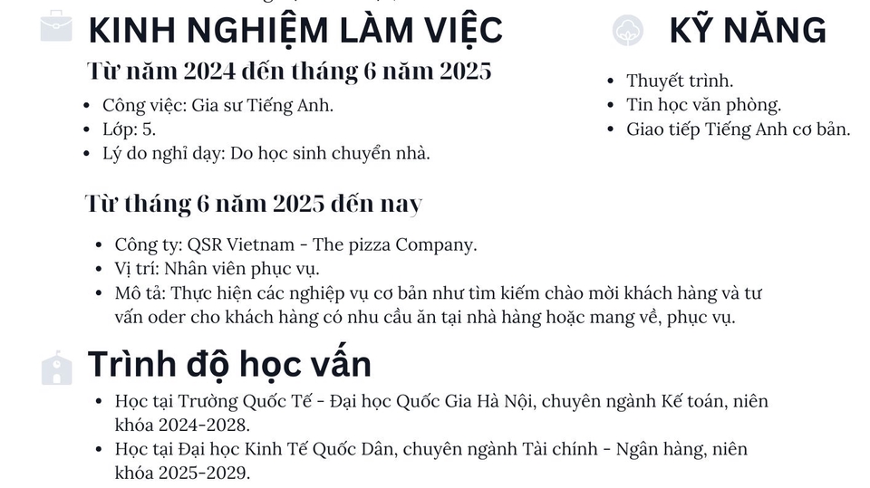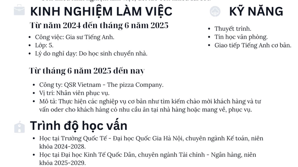 Intern Freelancer Có khả năng giao tiếp tốt, nhiều thời gian rảnh, còn là sinh viên nhưng không vướng bận lịch học. Đã từng làm qua mảng sale, hr tuyển dụng, F&B (The pizza company - khoảng 6 tháng) Có khả năng giao tiếp tiếng anh ở mức khá.