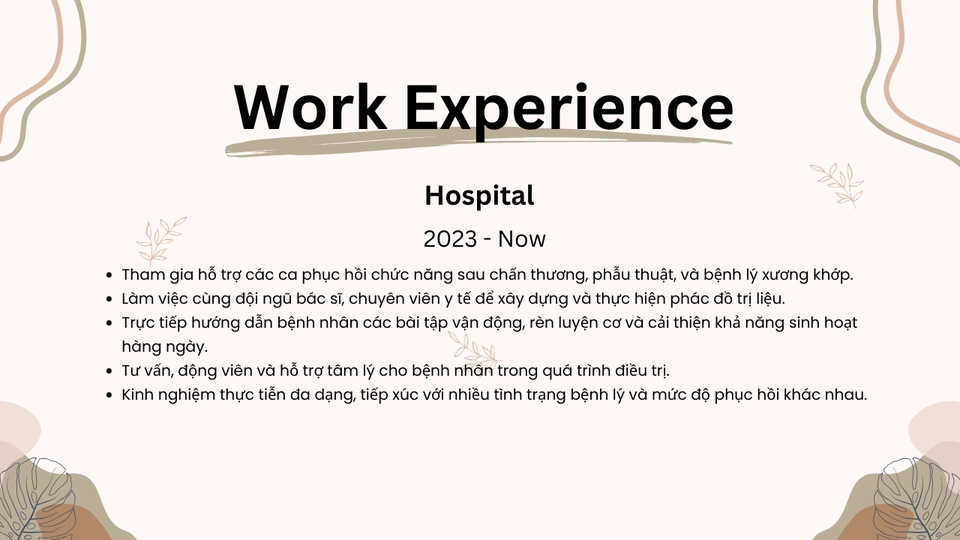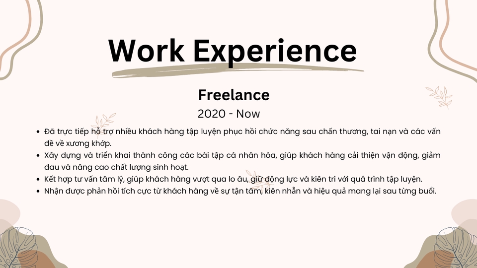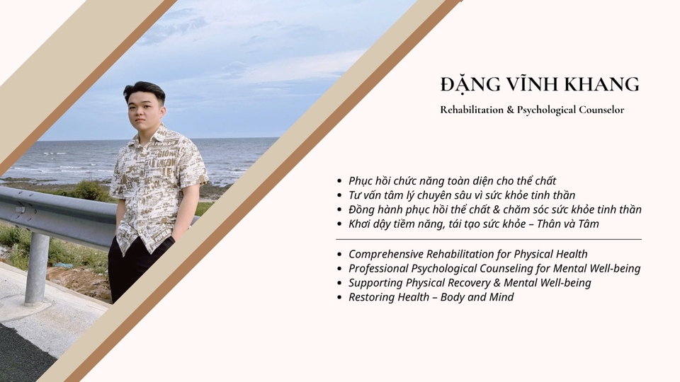 Xin chào bạn, tôi là Vĩnh Khang, một nhân viên y tế Gen Z. Vì còn trẻ nên tôi có thể chưa có nhiều kinh nghiệm, nhưng thứ tôi có thể cung cấp cho bạn chính là kiến thức chuyên môn, sự năng động cũng như thời gian bên cạnh bạn. Sau đây là bảng mô tả công việc của tôi: MÔ TẢ CHI TIẾT CÔNG VIỆC Vị trí: Chuyên viên Phục hồi chức năng & Tư vấn tâm lý 1. Tổng quan công việc Với vai trò Chuyên viên Phục hồi chức năng & Tư vấn tâm lý, tôi sẽ đồng hành cùng bạn trong cả hành trình phục hồi thể chất và chăm sóc sức khỏe tinh thần. Công việc không chỉ dừng lại ở việc giúp bạn cải thiện khả năng vận động, lấy lại sự linh hoạt trong sinh hoạt hàng ngày, mà còn hỗ trợ bạn vượt qua khó khăn tâm lý, cân bằng cảm xúc và nâng cao chất lượng cuộc sống toàn diện. 2. Nhiệm vụ chính Đánh giá tình trạng sức khỏe của bạn: Tôi sẽ lắng nghe câu chuyện, khai thác tiền sử, thực hiện các bài kiểm tra và quan sát để hiểu rõ nhu cầu phục hồi và trạng thái tinh thần của bạn. Xây dựng kế hoạch cá nhân hóa: Mỗi người có một tình trạng khác nhau, vì thế tôi sẽ thiết kế cho bạn chương trình phục hồi chức năng riêng biệt, từ các bài tập vận động, trị liệu cơ – xương – khớp đến những kỹ thuật thư giãn và cân bằng thần kinh. Tư vấn và trị liệu tâm lý: Bạn sẽ nhận được những buổi trò chuyện, tư vấn hoặc trị liệu cá nhân/nhóm nhằm giải tỏa căng thẳng, vượt qua sang chấn, học cách ứng phó tích cực và giữ được tinh thần lạc quan. Theo dõi tiến trình: Tôi sẽ đồng hành trong suốt quá trình, theo dõi sự tiến bộ của bạn, điều chỉnh kế hoạch khi cần để đảm bảo hiệu quả tối ưu. Hỗ trợ gia đình bạn: Tôi không chỉ làm việc cùng bạn mà còn hướng dẫn gia đình cách đồng hành, chăm sóc và tạo môi trường thuận lợi cho sự phục hồi của bạn. Phối hợp chuyên môn: Khi cần thiết, tôi sẽ phối hợp cùng đội ngũ bác sĩ, điều dưỡng, chuyên gia vật lý trị liệu và nhà tâm lý học để mang lại cho bạn một dịch vụ chăm sóc toàn diện. 3. Kỹ năng và phẩm chất mà bạn nhận được Kiến thức chuyên môn vững chắc trong lĩnh vực phục hồi chức năng và tâm lý trị liệu. Khả năng lắng nghe, thấu hiểu để bạn cảm thấy được tôn trọng và sẻ chia. Kỹ năng quản lý và lập kế hoạch giúp tiến trình phục hồi của bạn khoa học và rõ ràng. Tinh thần trách nhiệm, kiên nhẫn và tận tâm, luôn đặt lợi ích sức khỏe của bạn lên hàng đầu. Khả năng phối hợp đa chuyên ngành, đảm bảo bạn được hưởng sự chăm sóc tốt nhất từ nhiều khía cạnh. 4. Giá trị dành cho bạn Về thể chất: Bạn sẽ cải thiện khả năng vận động, giảm đau, nâng cao sức khỏe và sự tự tin trong sinh hoạt hàng ngày. Về tinh thần: Bạn được hỗ trợ giải tỏa căng thẳng, vượt qua những lo âu, tái tạo năng lượng sống và giữ thái độ tích cực. Về gia đình: Người thân của bạn cũng được chia sẻ kiến thức, kỹ năng để cùng bạn đi qua quá trình hồi phục một cách hiệu quả. Về xã hội: Khi bạn khỏe mạnh hơn, bạn sẽ tự tin tham gia vào cuộc sống, công việc và đóng góp tích cực cho cộng đồng. 5. Định hướng phát triển cho bạn Dịch vụ Phục hồi chức năng & Tư vấn tâm lý không chỉ mang đến hỗ trợ trước mắt mà còn hướng đến sự bền vững lâu dài. Khi hợp tác cùng tôi, bạn có thể: Nhận được chương trình trị liệu chuyên biệt phù hợp với tình trạng hiện tại. Tiếp cận các phương pháp mới, cập nhật, khoa học và an toàn. Có cơ hội duy trì lối sống khỏe mạnh, cân bằng sau khi kết thúc chương trình. Tìm thấy sự đồng hành đáng tin cậy, lâu dài trong hành trình chăm sóc sức khỏe thân – tâm.