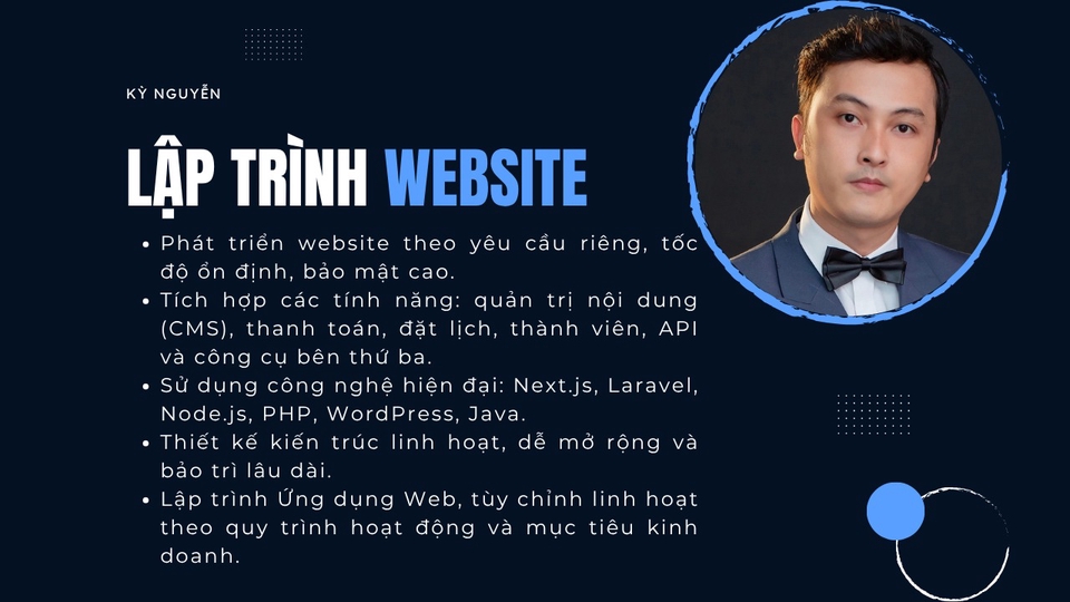 1. Thiết kế Website - Giao diện hiện đại, chuẩn thương hiệu, tối ưu trải nghiệm người dùng (UX/UI). - Hiển thị tốt trên mọi thiết bị: máy tính, tablet, điện thoại. - Thiết kế theo mục tiêu cụ thể: website doanh nghiệp, hồ sơ cá nhân, landing page, blog, cửa hàng online. - Đảm bảo tốc độ tải nhanh, cấu trúc logic và khả năng nhận diện thương hiệu cao. 2. Lập trình Website & Hệ thống Web - Phát triển website theo yêu cầu riêng, tốc độ ổn định, bảo mật cao. - Tích hợp các tính năng: quản trị nội dung (CMS), thanh toán, đặt lịch, thành viên, API và công cụ bên thứ ba. - Sử dụng công nghệ hiện đại: Next.js, Laravel, Node.js, PHP, WordPress, Java. - Thiết kế kiến trúc linh hoạt, dễ mở rộng và bảo trì lâu dài. 3. Lập trình Ứng dụng Web (Web App) - Xây dựng hệ thống quản lý trực tuyến: CRM, dashboard, ứng dụng nội bộ, SaaS. - Thiết kế giao diện trực quan, phân quyền người dùng, tự động kết nối dữ liệu. - Tùy chỉnh linh hoạt theo quy trình hoạt động và mục tiêu kinh doanh.