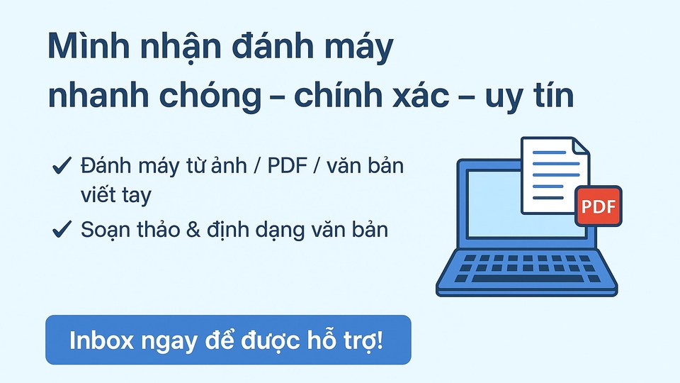 Bạn cần đánh máy, soạn thảo hay chuyển đổi văn bản từ hình ảnh/PDF sang file có thể chỉnh sửa? Mình nhận đánh máy nhanh chóng – chính xác – uy tín. ✔ Đánh máy từ ảnh/PDF/văn bản viết tay ✔ Soạn thảo & định dạng văn bản