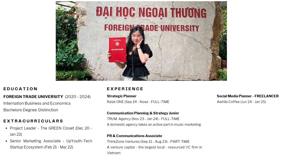 Với hơn 3 năm trong lĩnh vực marketing, và 1 năm kinh nghiệm làm Planner, mình đã và đang làm những lĩnh vực là điều hòa, ô tô, energy drink, soft drink, anime, ready-to-eat food, thời trang, ngân hàng, với đa dạng những proposal như: communication/ IMC/ social building/ brand vision.