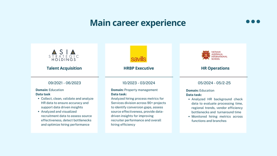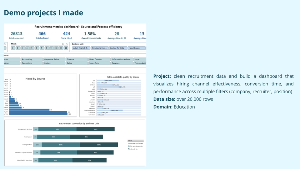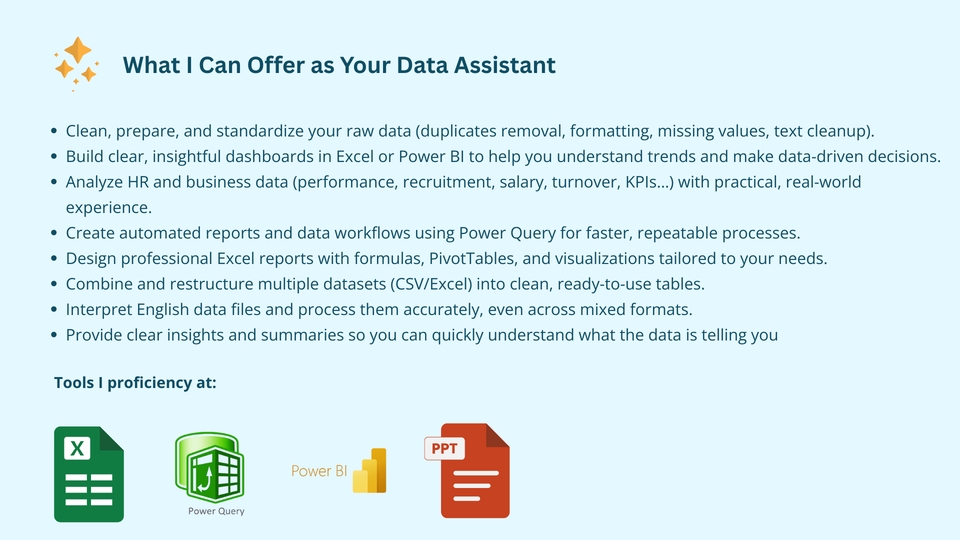 Các công việc mình có thể thực hiện: - Xử lý và làm sạch dữ liệu để gọn gàng, dễ sử dụng - Tính toán, tổng hợp số liệu và làm biểu đồ rõ ràng giúp bạn nắm thông tin nhanh. - Nhập liệu Excel theo đúng form hoặc yêu cầu bạn đưa - Tạo và trình bày bảng biểu dễ đọc - Đọc, hiểu và xử lý dữ liệu/tài liệu tiếng Anh - Công cụ xử lý dữ liệu thành thạo: excel, power query, PBI (mức căn bản)