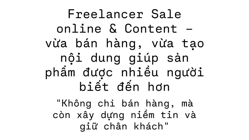 Hello everyone, em tên là Nga. Em đã có kinh nghiệm telesale, tư vấn và chốt đơn online lẫn trực tiếp. Em mạnh về giao tiếp, đàm phán và chăm sóc khách hàng, từng hỗ trợ marketing (content, video, banner) và trực page online 24/24. Liên hệ để biết thêm chi tiết. Sales freelancer-turning leads into loyal customers
