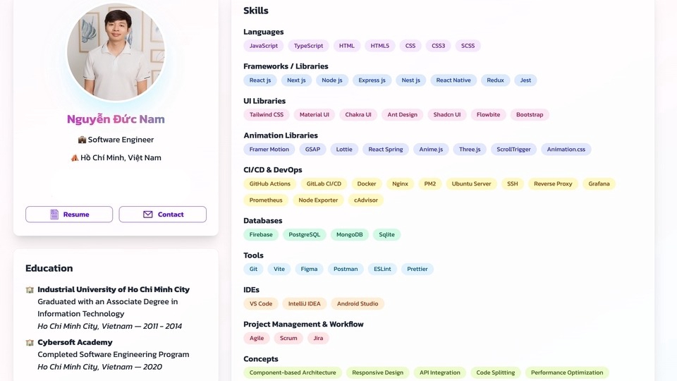 Tôi là Frontend Developer với hơn 4 năm kinh nghiệm, chuyên về React.js, Next.js, TypeScript, JavaScript, HTML và CSS. Tôi thành thạo các CSS framework như Tailwind, Material UI, Booốttrap… và có kinh nghiệm backend với Node.js, Express, Nest.js, RESTful API, MongoDB và PostgreSQL. Tôi tập trung xây dựng ứng dụng web hiện đại, tối ưu hiệu suất và mang lại trải nghiệm người dùng tốt.
