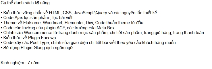 Tôi là một lập trình viên WordPress giàu kinh nghiệm với khả năng phát triển cả front-end và back-end. Tôi thành thạo việc tạo và tùy chỉnh theme, plugin, cũng như quản lý và tối ưu hóa website.