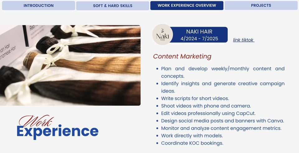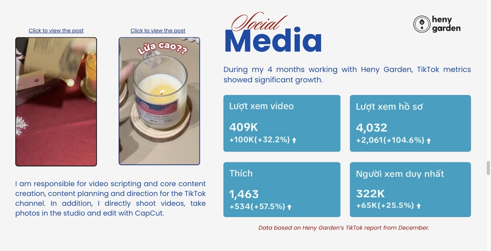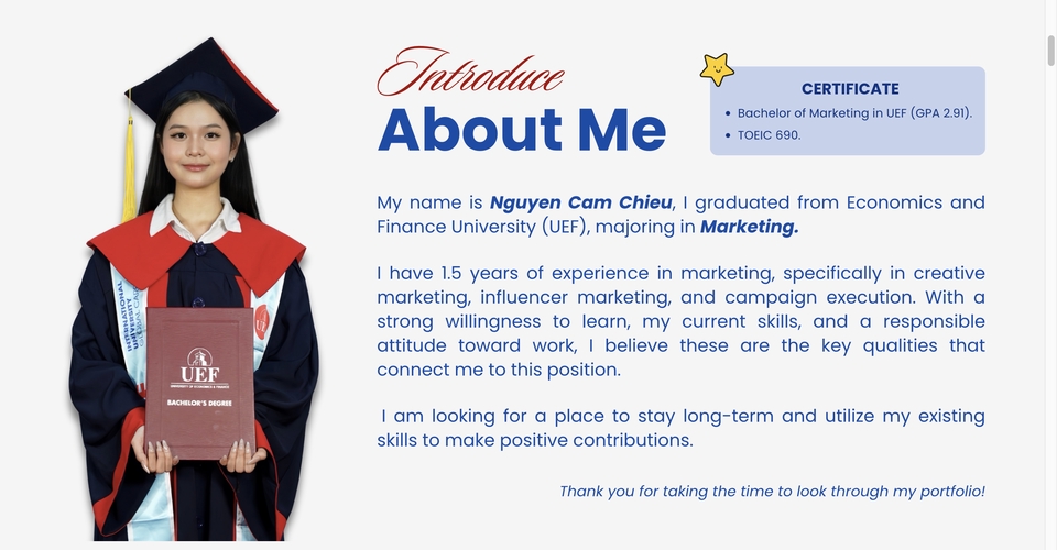 I am Cam Chieu – a Content Marketer specializing in creating social media content. With 1.5 years of experience, I have collaborated with multiple brands, including helping one achieve 3 videos with +1M views and more than 25 videos with +100K views within a year. I can produce 6–7 videos per week, staying up to date with trends to ensure continuous channel growth.
