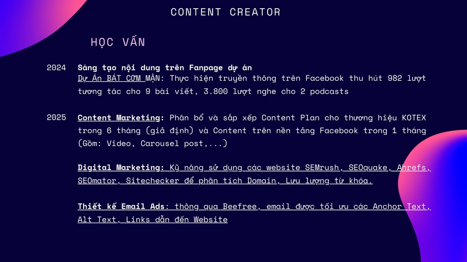 - Sinh viên xuất sắc chuyên ngành Marketing - Khả năng viết content tốt - Khả năng tổng hợp và phân tích thông tin dữ liệu - Đúng deadline - Hiệu suất