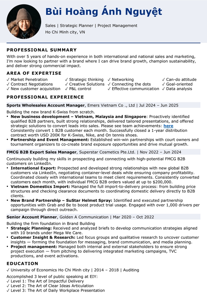 I can offer: Market research and a deep understanding of target customer insights Writing sales copies on various platforms that are relevant to the target customer Building strong relationships with potential customers, arranging meetings to understand their needs, and presenting the company profile and outstanding projects Negotiating and closing deals Translations between English and Vietnamese