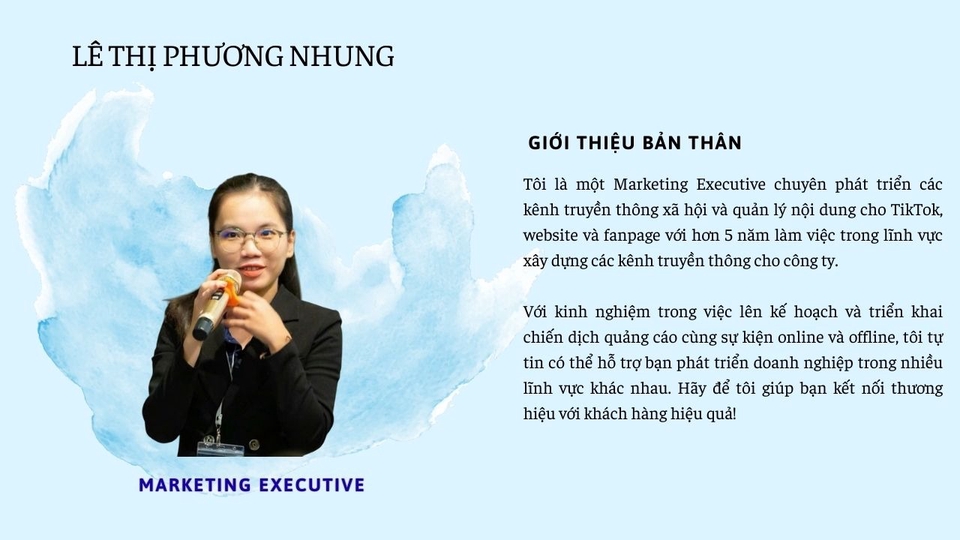 Tôi là một Marketing Executive chuyên phát triển các kênh truyền thông xã hội và quản lý nội dung cho TikTok, website và fanpage. Với kinh nghiệm trong việc lên kế hoạch và triển khai chiến dịch quảng cáo cùng sự kiện online và offline, tôi tự tin có thể hỗ trợ bạn phát triển doanh nghiệp trong nhiều lĩnh vực khác nhau. Hãy để tôi giúp bạn kết nối thương hiệu với khách hàng hiệu quả!