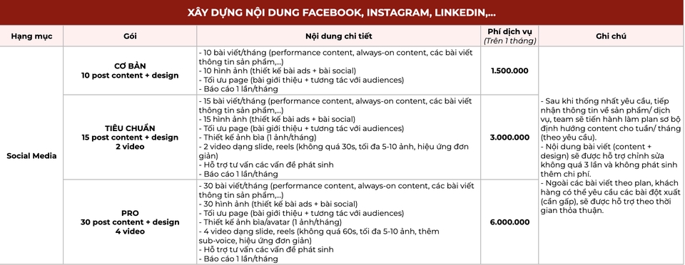 GÓI CƠ BẢN: 10 post content + design Nội dung chi tiết: - 10 bài viết/tháng (performance content, always-on content, các bài viết thông tin sản phẩm,...) - 10 hình ảnh (thiết kế bài ads + bài social) - Tối ưu page (bài giới thiệu + tương tác với audiences) - Báo cáo 1 lần/tháng ----- GÓI TIÊU CHUẨN: 15 post content + design; 2 video Nội dung chi tiết: - 15 bài viết/tháng (performance content, always-on content, các bài viết thông tin sản phẩm,...) - 15 hình ảnh (thiết kế bài ads + bài social) - Tối ưu page (bài giới thiệu + tương tác với audiences) - Thiết kế ảnh bìa (1 ảnh/tháng) - 2 video dạng slide, reels (không quá 30s, tối đa 5-10 ảnh, hiệu ứng đơn giản) - Hỗ trợ tư vấn các vấn đề phát sinh - Báo cáo 1 lần/tháng ----- GÓI PRO: 30 post content + design; 4 video Nội dung chi tiết: - 15 bài viết/tháng (performance content, always-on content, các bài viết thông tin sản phẩm,...) - 15 hình ảnh (thiết kế bài ads + bài social) - Tối ưu page (bài giới thiệu + tương tác với audiences) - Thiết kế ảnh bìa (1 ảnh/tháng) - 2 video dạng slide, reels (không quá 30s, tối đa 5-10 ảnh, hiệu ứng đơn giản) - Hỗ trợ tư vấn các vấn đề phát sinh - Báo cáo 1 lần/tháng TẶNG: 3 KỊCH BẢN SHORT-VIDEO THEO YÊU CẦU ----- Ghi chú: - Sau khi thống nhất yêu cầu, tiếp nhận thông tin về sản phẩm/ dịch vụ, team sẽ tiến hành làm plan sơ bộ định hướng content cho tuần/ tháng (theo yêu cầu). - Nội dung bài viết (content + design) sẽ được hỗ trợ chỉnh sửa không quá 3 lần và không phát sinh thêm chi phí. - Ngoài các bài viết theo plan, khách hàng có thể yêu cầu các bài đột xuất (cần gấp), sẽ được hỗ trợ theo thời gian thỏa thuận.