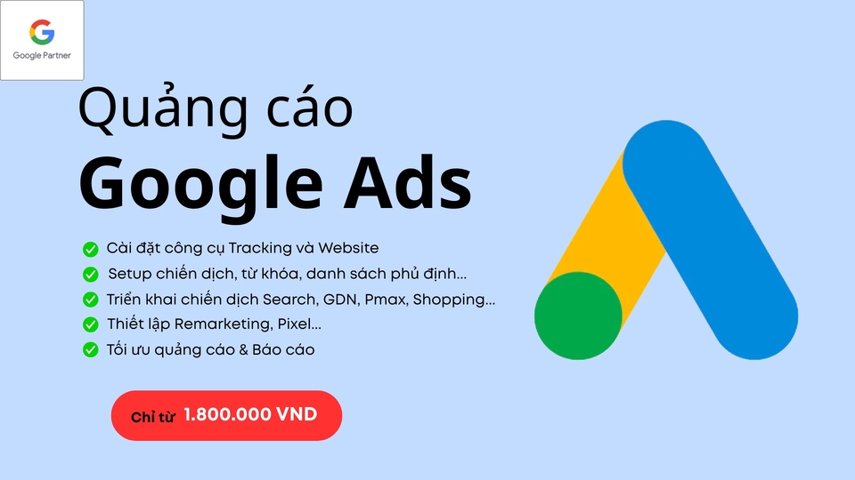 ₫1,8 triệuDịch vụ Google Ads trọn gói giúp tiếp cận đúng khách hàng đang tìm kiếm. Triển khai Search, GDN, Pmax, cài tracking, remarketing và tối ưu hiệu quả.