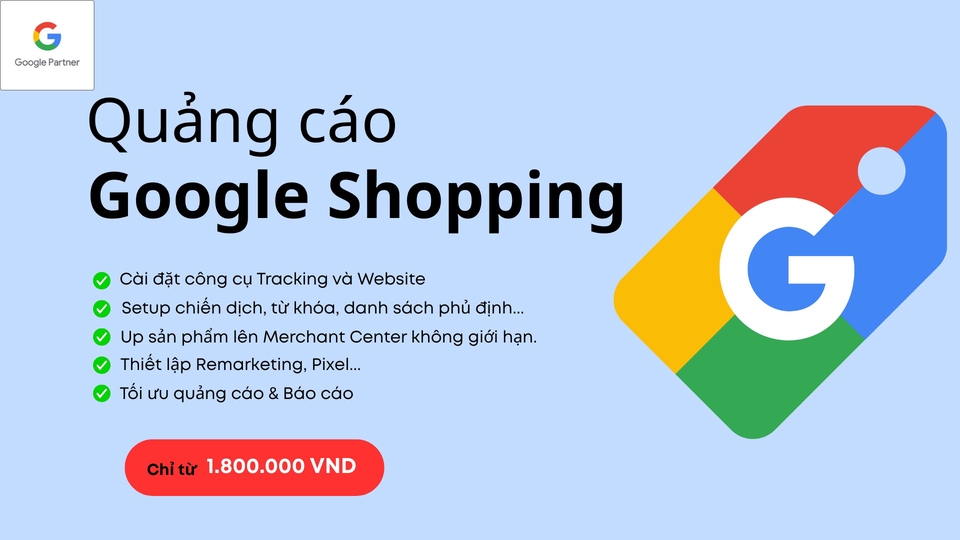 ₫5,0 triệuDịch vụ Google Shopping trọn gói cho shop <2000 sản phẩm, giúp tăng hiển thị, tiếp cận khách hàng mua sẵn và tối ưu chi phí quảng cáo.