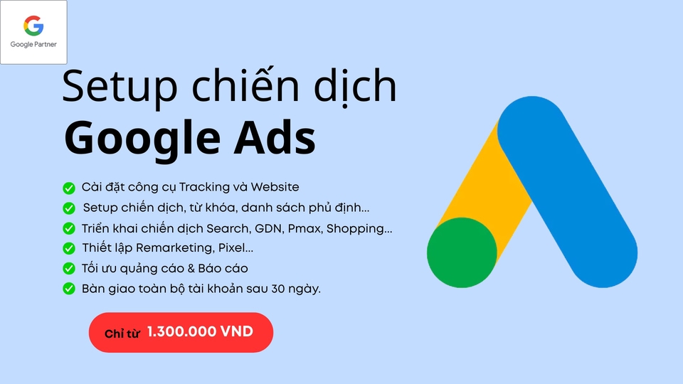 ₫1,3 triệuTư vấn & thiết lập tối đa 7 chiến dịch Google Ads (trừ Google Shopping). Phù hợp cho cá nhân Saler và doanh nghiệp nhỏ. Setup đầy đủ bàn giao tài khoản cho khách hàng tự quản lý. Bảo hành 3 tháng.