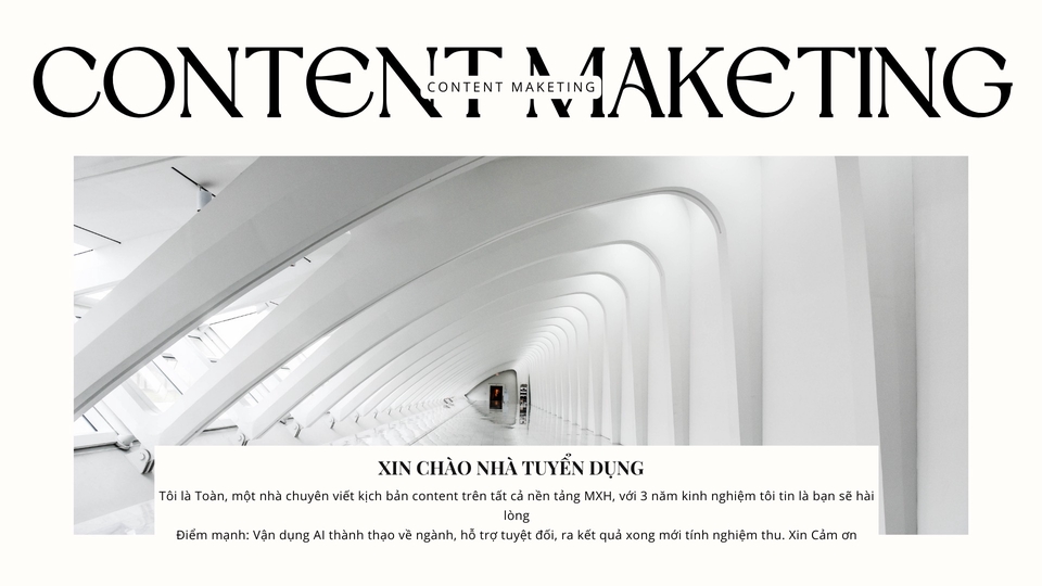 Xin chào nhà tuyển dụng Tôi chuyên viết content, viết bài đăng mạng xã hội, kịch bản video Youtube, Tiktok, bài viết chuẩn SEO. Không chỉ vậy tôi thiết kế hình ảnh minh họa đính kèm bài viết sử dụng thành thạo AI chuyên dụng 1. Nhận chỉ đạo từ khách hàng 2. Phân tích: yêu cầu, sản phẩm, đối thủ, thị trường... 3. Viết ý tưởng/dàn ý/mẫu 4. Gửi khách hàng dàn ý để duyệt 5. Nghiệm thu