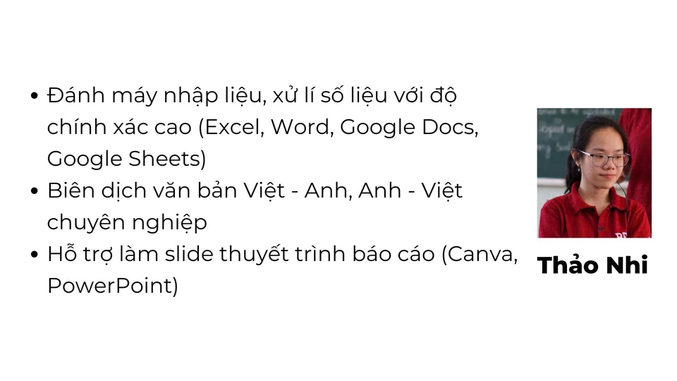 1. Đánh máy nhập liệu, xử lí số liệu với độ chính xác cao (Excel, Word, Google Docs, Google Sheets) 2. Biên dịch văn bản Việt - Anh, Anh - Việt chuyên nghiệp 3. Hỗ trợ làm slide thuyết trình báo cáo (Canva, PowerPoint)