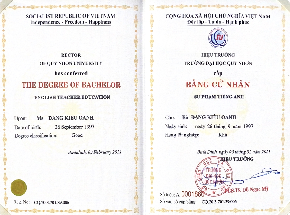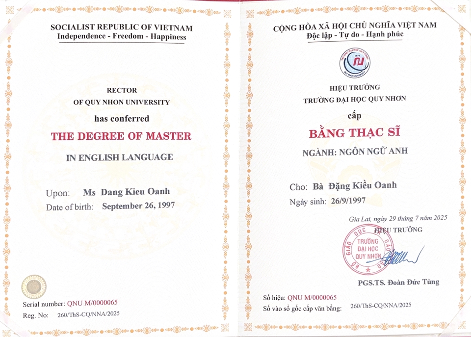Tôi là Đặng Kiều Oanh – giáo viên tiếng Anh, Cử nhân Sư phạm và Thạc sĩ Ngôn ngữ Anh. Với niềm đam mê ngôn ngữ và giảng dạy, tôi mang đến bản dịch và bài học tiếng Anh tự nhiên, dễ hiểu, và truyền cảm hứng. Tỉ mỉ, sáng tạo và đúng hạn – tôi luôn hướng đến giá trị thật trong từng sản phẩm ngôn ngữ.