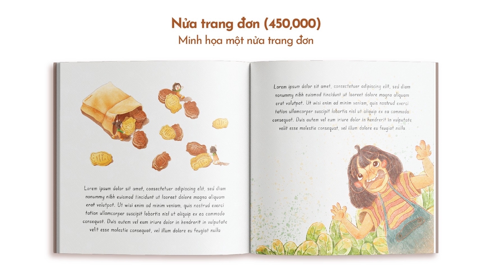 ₫8,0 triệuƯu đãi đặc biệt: giảm 20% (tiết kiệm 2.010.000₫ so với giá gốc 10.050.000₫) Gói dịch vụ Thiết kế tựa đề, nhân vật, bìa sách Minh họa nội dung (minh họa nhỏ, 1/2 hoặc full trang đơn/đôi)
