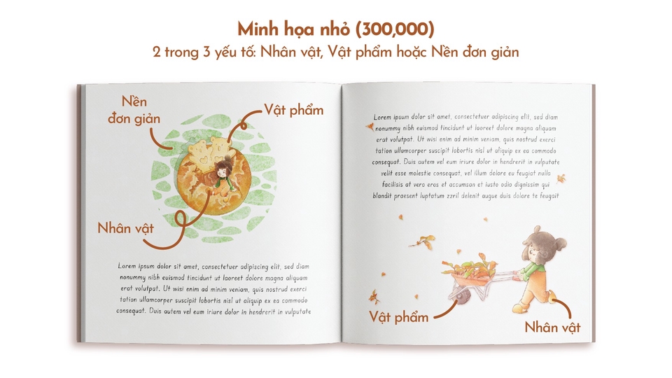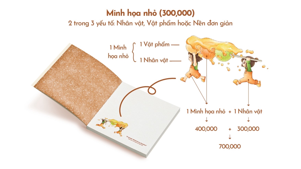 Lưu ý Giá áp dụng cho sách 12 trang (đã giảm 20%). Với số trang khác, vui lòng tham khảo chi tiết tại mục “Các gói dịch vụ” Gói dịch vụ Thiết kế tựa đề, nhân vật, bìa sách Minh họa nội dung (minh họa nhỏ, 1/2 hoặc full trang đơn/đôi) Ưu đãi trọn gói (giảm trên toàn bộ giá sách) 12-16 trang → Giảm 20% 20-28 trang → Giảm 25% 32+ trang → Giảm 30% Tặng kèm Layout sách & mockup miễn phí Layout trang bổ sung (giới thiệu, mục lục, v.v.) miễn phí khi dùng artwork từ dự án Quy trình & Chỉnh sửa 1. Thảo luận → Báo giá 2. Ý tưởng → Chỉnh tối đa 2 lần 3. Nét → Chỉnh tối đa 2 lần 4. Màu → Chỉnh tối đa 2 lần nhỏ 5. Bàn giao file Vượt số lần chỉnh sửa: +10% → +35% tùy mức độ (tính riêng từng tranh) Bản quyền (tính trên toàn bộ sách) Cá nhân: +0% Riêng tư: +20% (không công khai) Thương mại: +50% Độc quyền: +100% Giao file File JPG, PNG, PDF chất lượng cao & File gốc (PSD/AI) In ấn/bản vật lý: báo trước để nhận báo giá Không nhận Dự án chứa nội dung nhạy cảm, phản cảm, vi phạm pháp luật