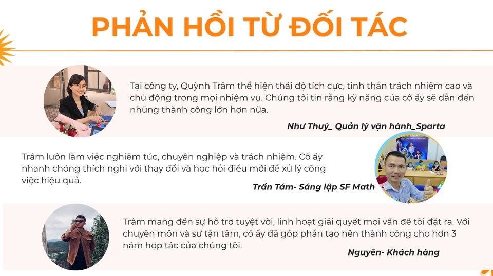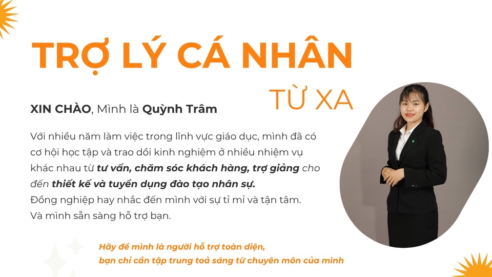 XIN CHÀO, Mình là Quỳnh Trâm Với nhiều năm làm việc trong lĩnh vực giáo dục, mình đã có cơ hội học tập và trao dồi kinh nghiệm ở nhiều nhiệm vụ khác nhau từ tư vấn, chăm sóc khách hàng, trợ giảng cho đến thiết kế và tuyển dụng đào tạo nhân sự. Đồng nghiệp hay nhắc đến mình với sự tỉ mỉ và tận tâm. Và mình sẵn sàng hỗ trợ bạn.