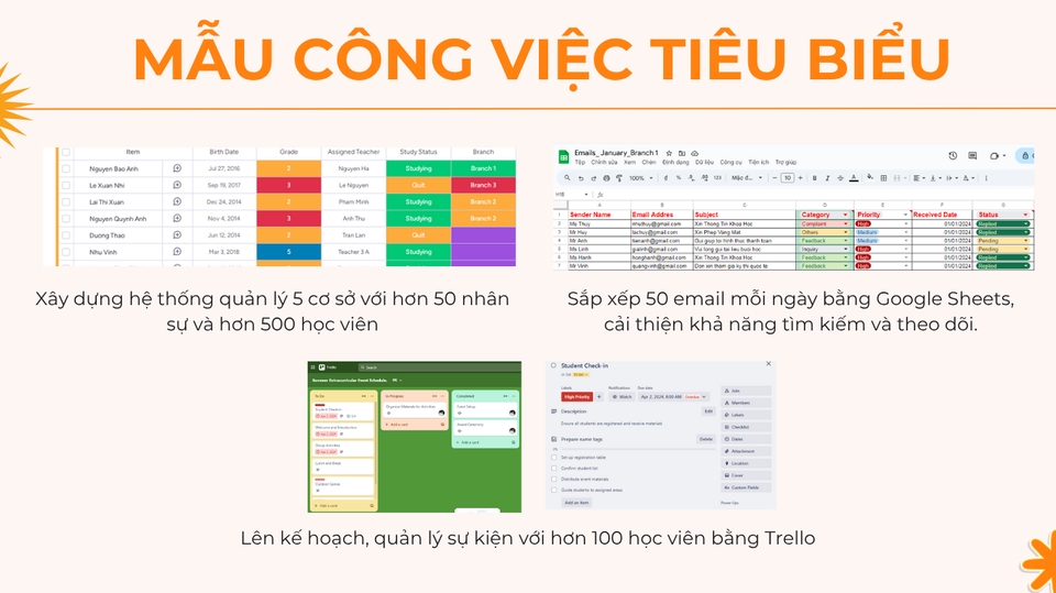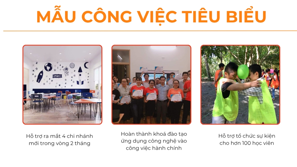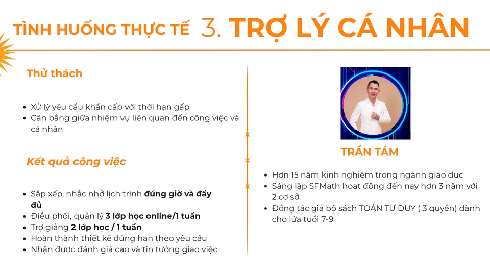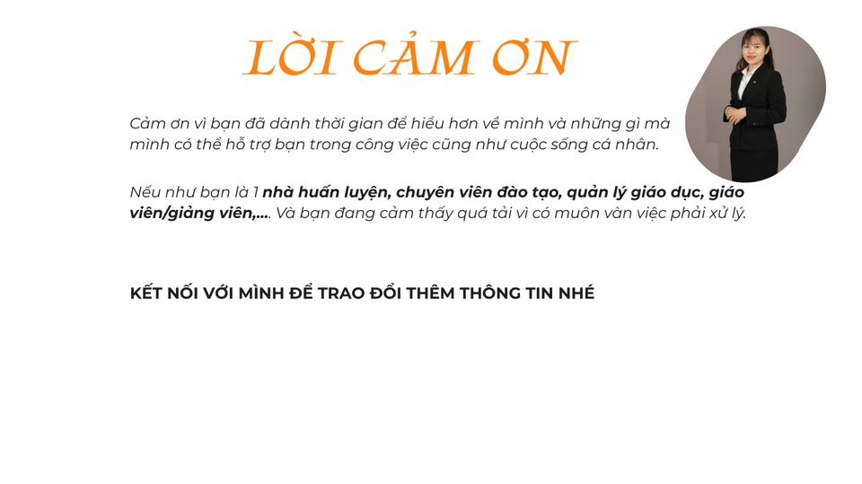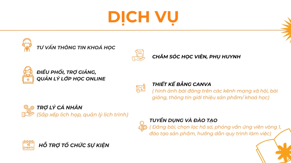 Tôi giúp bạn giảm tải khối lượng công việc liên quan đến: - TƯ VẤN THÔNG TIN KHOÁ HỌC - CHĂM SÓC HỌC VIÊN, PHỤ HUYNH - ĐIỀU PHỐI, TRỢ GIẢNG, QUẢN LÝ LỚP HỌC ONLINE - THIẾT KẾ BẰNG CANVA (Hình ảnh bài đăng trên các kênh mạng xã hội, bài giảng, thông tin giới thiệu sản phẩm/ khoá học) - TUYỂN DỤNG VÀ ĐÀO TẠO ( Đăng bài, chọn lọc hồ sơ, phỏng vấn ứng viên vòng 1, đào tạo sản phẩm, hướng dẫn quy trình làm việc) - TRỢ LÝ CÁ NHÂN (Sắp xếp lịch họp, quản lý lịch trình) - HỖ TRỢ TỔ CHỨC SỰ KIỆN