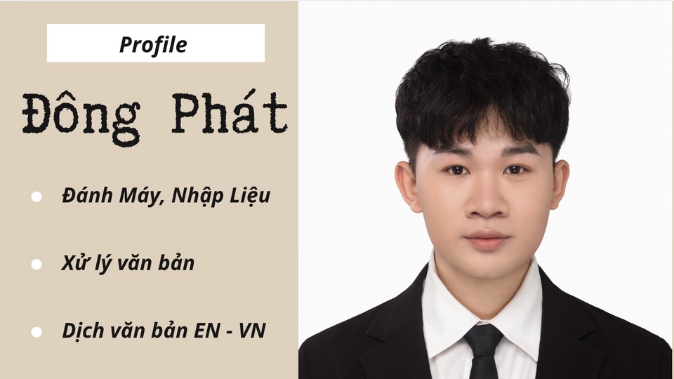 - Đánh máy, nhập liệu văn bản. - Xử lý Data trên Excel. - Dịch văn bản, hội thoại, Sub: VN - EN, EN - VN - Cam kết, bảo mật thông tin. Tận tâm, cam kết đúng thời hạn, chính xác, chỉnh chu trong từng chi tiết nhỏ, hoàn tất công việc đến cùng.