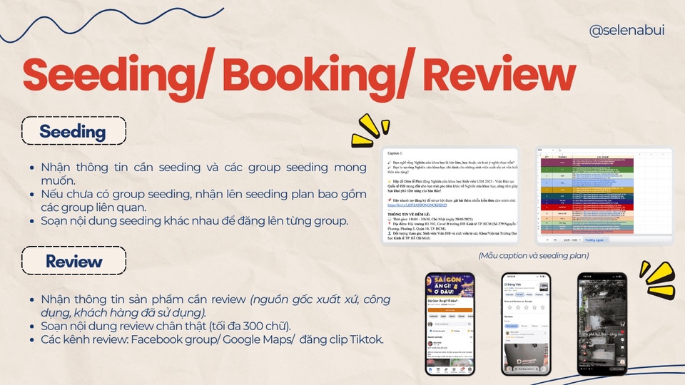 1. Nhận viết các bài review/ seeding (từ 100-300 chữ) về các sản phẩm/ dịch vụ của doanh nghiệp. 2. Cách thức nhận công việc (điều kiện khách hàng đã có sẵn nội dung và danh sách group seeding): - Trao đổi với khách hàng để hiểu thêm về dịch vụ/ sản phẩm cần đánh giá. - Khách hàng đưa ra các group cần seeding và caption bài đăng quảng cáo. - Trả lại nội dung seeding dạng file excel gồm link các bài đăng/ comment Lưu ý: thời gian phụ thuộc vào tình hình thực tế admin của các group duyệt nội dung. 3. Cách thức nhận công việc (điều kiện khách hàng chưa có sẵn nội dung và danh sách group seeding): - Trao đổi với khách hàng để hiểu thêm về dịch vụ/ sản phẩm cần đánh giá. - Khách hàng đưa ra 3 điểm mạnh của sản phẩm mong muốn truyền tải đến người dùng. - Khách hàng đưa ra yêu cầu các group mong muốn seeding. - Trả lại nội dung seeding dạng file excel gồm: thông tin các group seeding, nội dung seeding đã soạn và tình trạng bài đăng. Lưu ý: thời gian đăng bài phụ thuộc vào tình hình thực tế admin của các group duyệt nội dung.